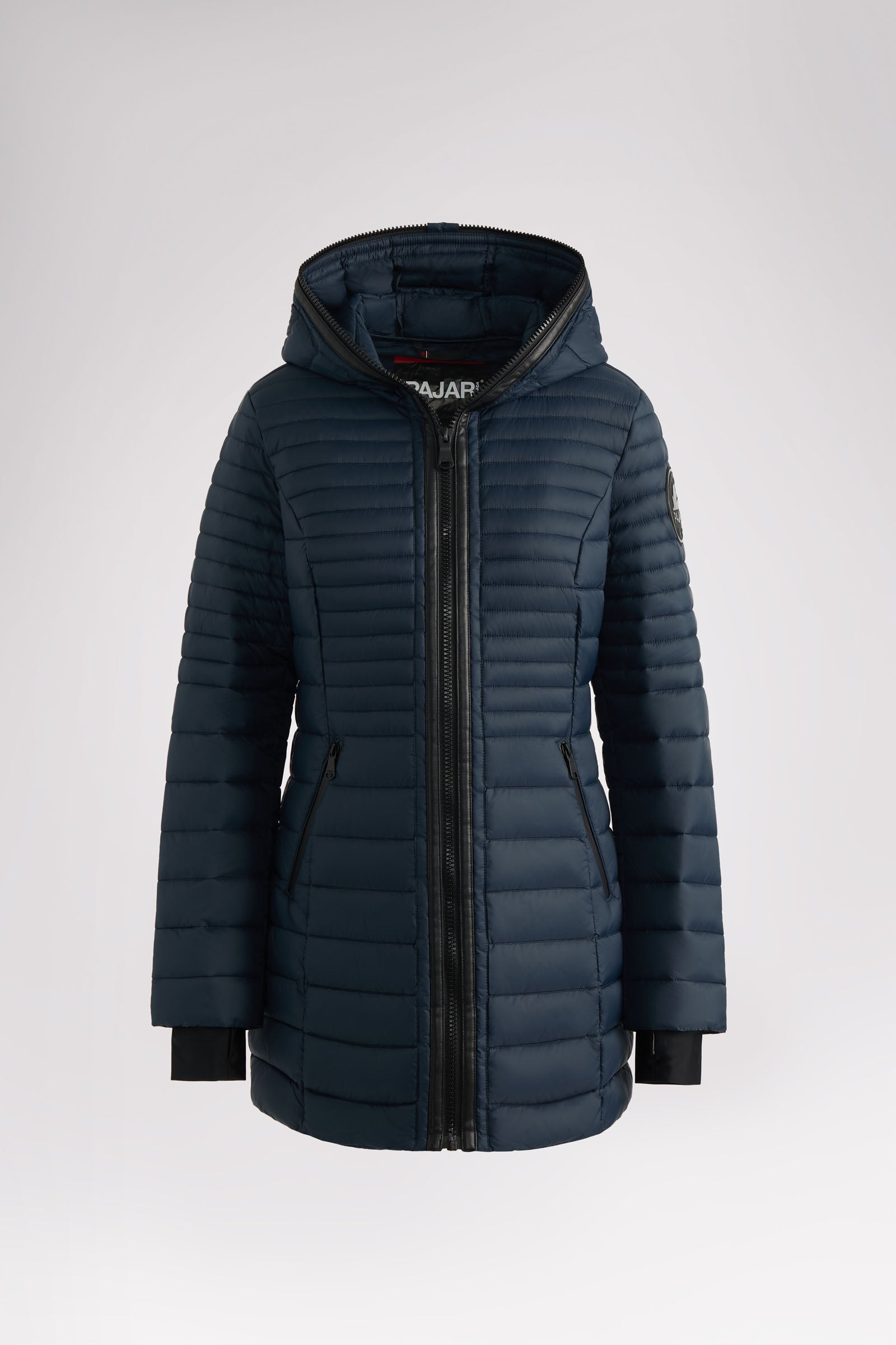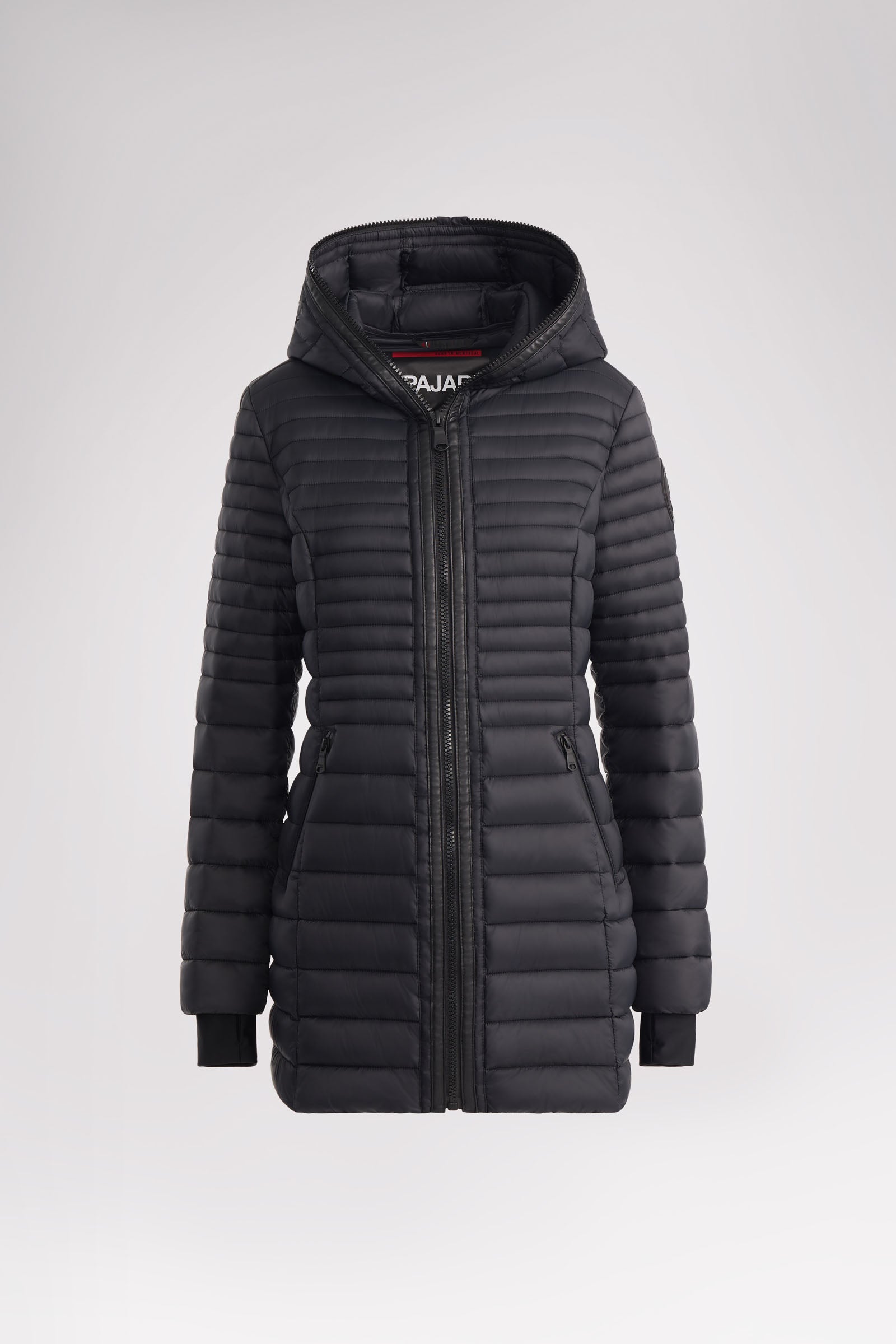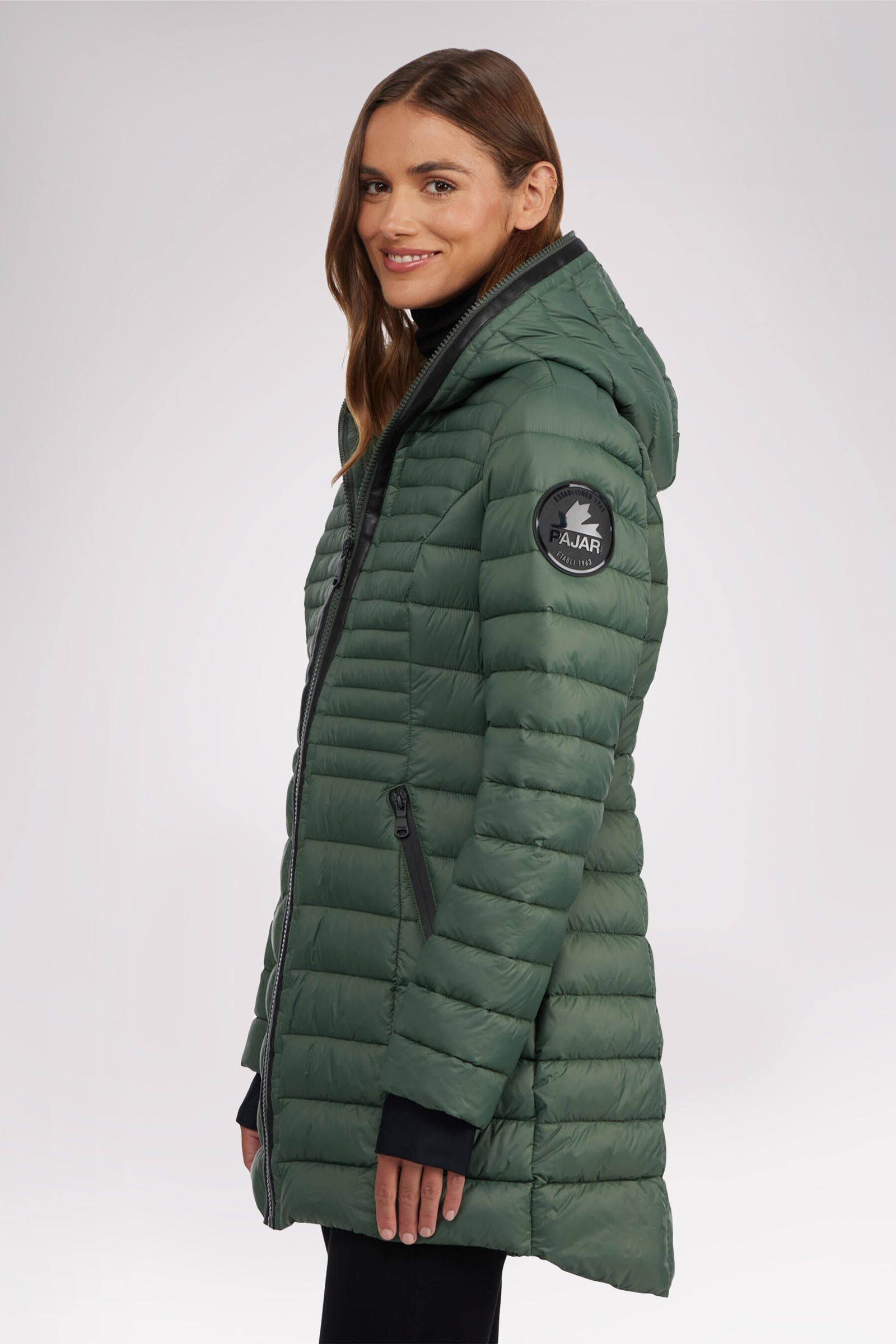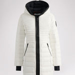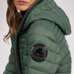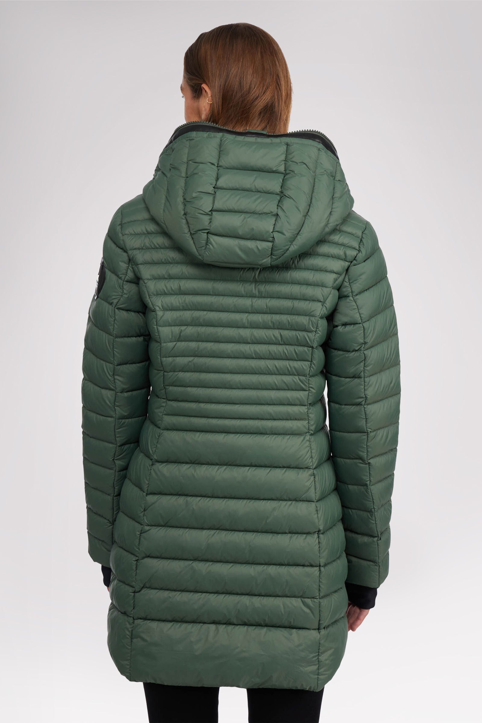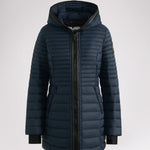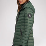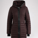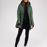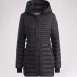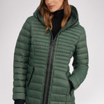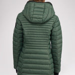 Manteau léger et compact matelassé en canaux pour femme 3M Featherless. Contour de fermeture éclair en polyuréthane. Équipé de fermeture éclair avant de haut en bas, de poches zippées, d’un ourlet hi-lo et d’un capuchon fixe. Manchettes tricotées avec trou pour pouce.