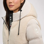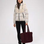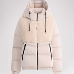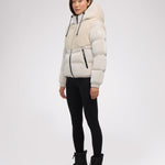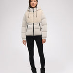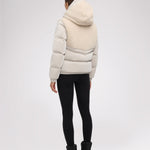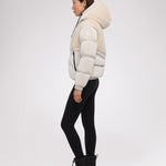 • Puffer court comprenant des tissus à multiples finitions avec capuchon fixe pour femme