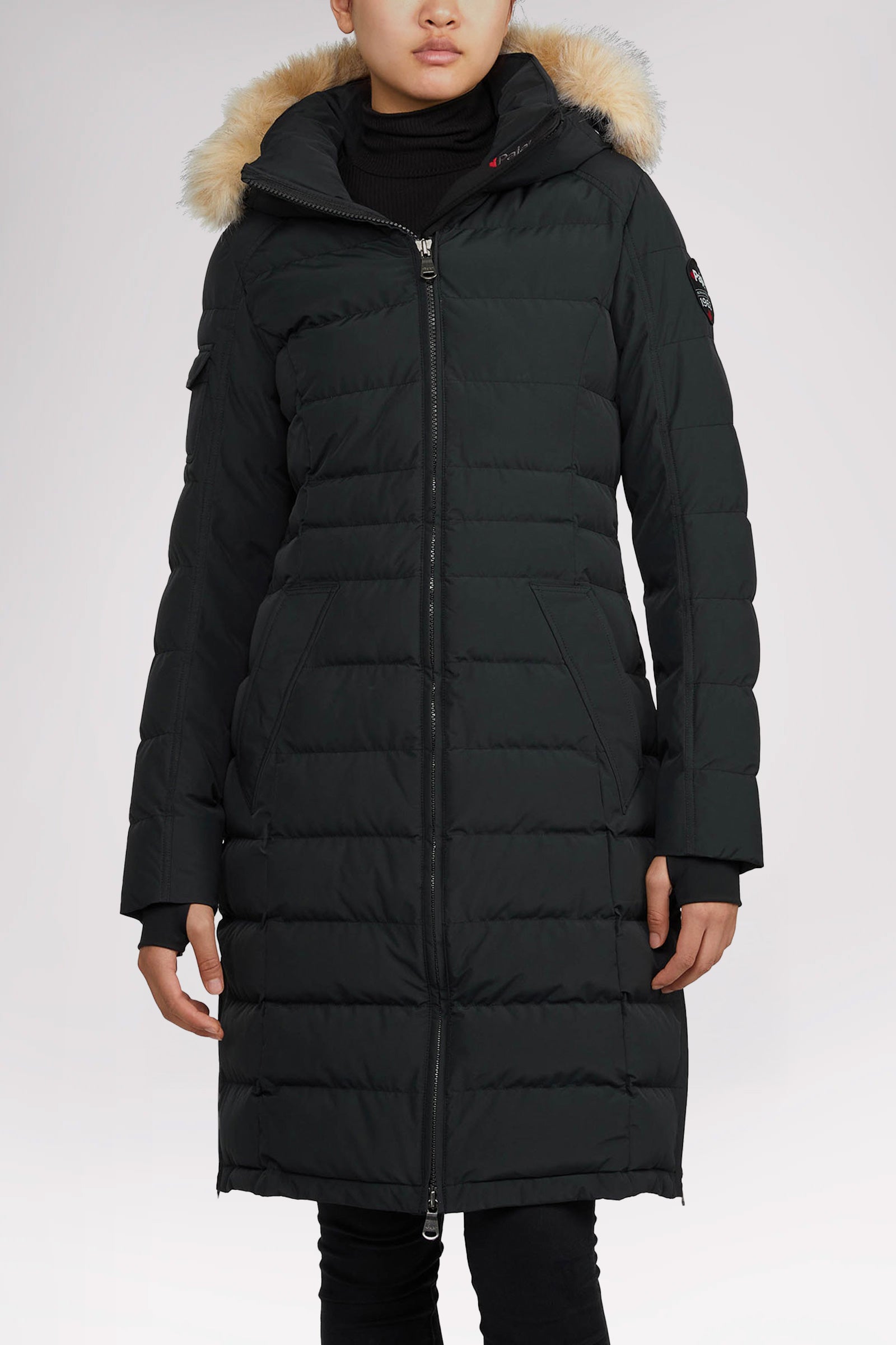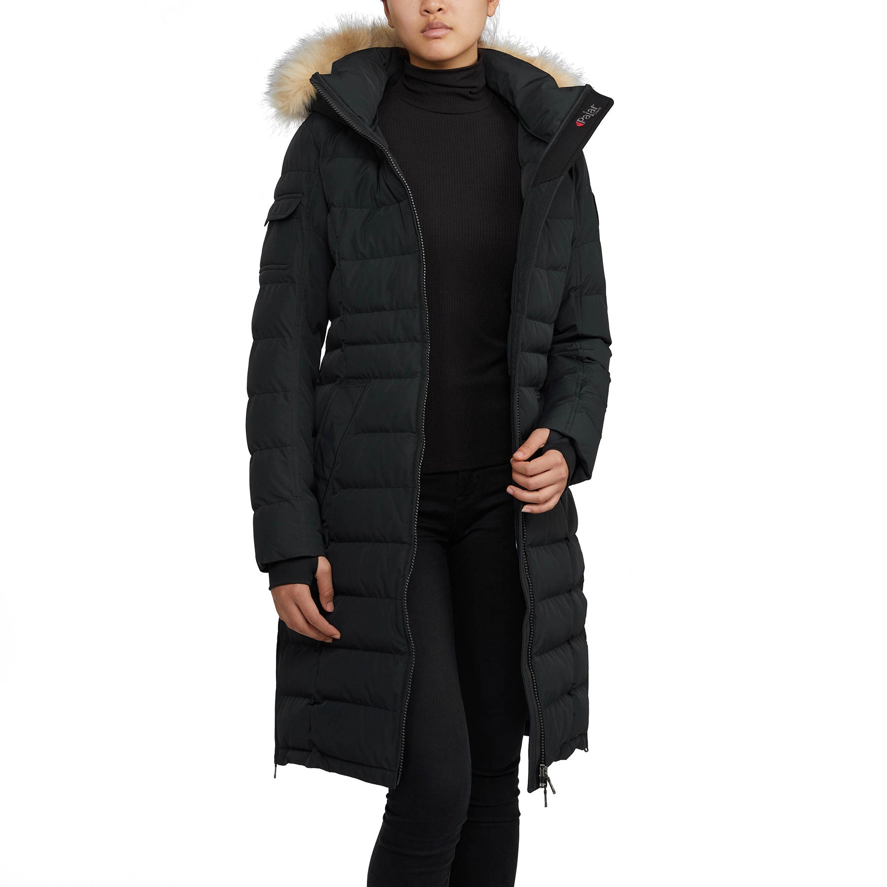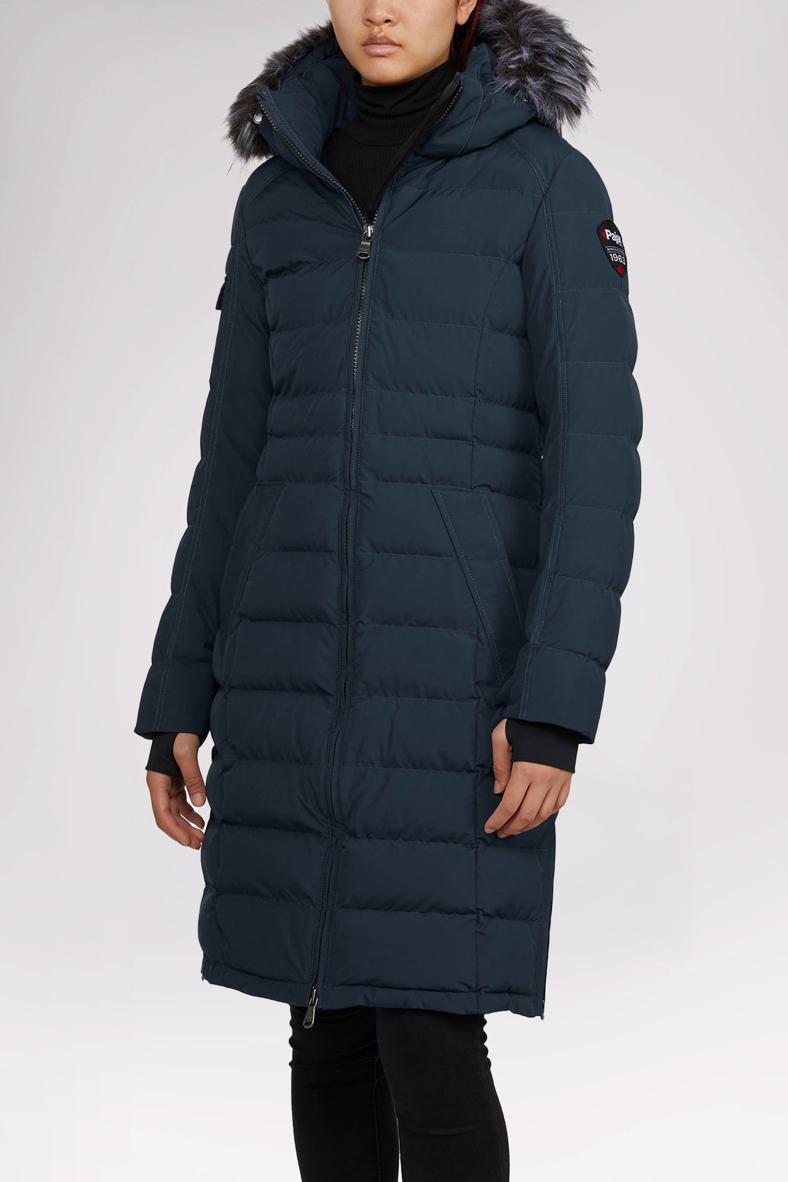 Puffer matelassé long en canaux pour femme avec capuchon et contour en fourrure amovibles. Équipé de poches passepoilées à fermeture à boutons-pression et manchettes tricotées élégantes.